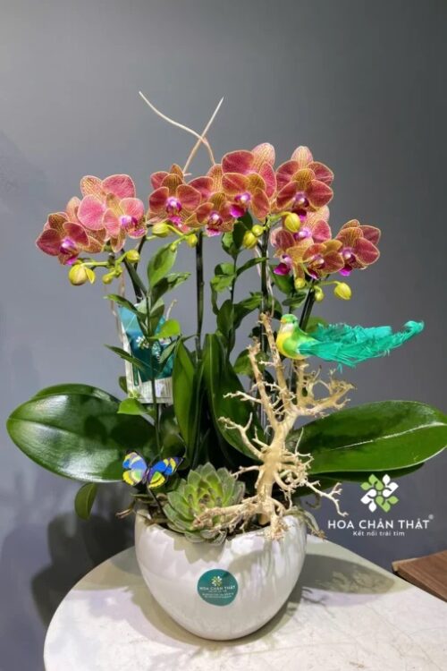 Lan Hồ Điệp mini là lựa chọn hoàn hảo dành cho những ai yêu thích vẻ đẹp thanh lịch của hoa lan nhưng muốn một kích thước nhỏ gọn, tinh tế. Với thân cây thấp, cành hoa mềm mại và những bông hoa xinh xắn nhiều màu sắc như trắng, hồng, vàng, tím,… lan hồ điệp mini mang đến cảm giác nhẹ nhàng và sang trọng cho mọi không gian. Nhờ kích thước nhỏ, loại lan này rất phù hợp để trang trí bàn làm việc, bàn trà, quầy lễ tân hoặc làm quà tặng ý nghĩa trong các dịp đặc biệt. Không chỉ đẹp, lan hồ điệp mini còn tượng trưng cho sự may mắn, hạnh phúc và thịnh vượng, khiến chúng trở thành món quà tinh tế được nhiều người yêu thích.