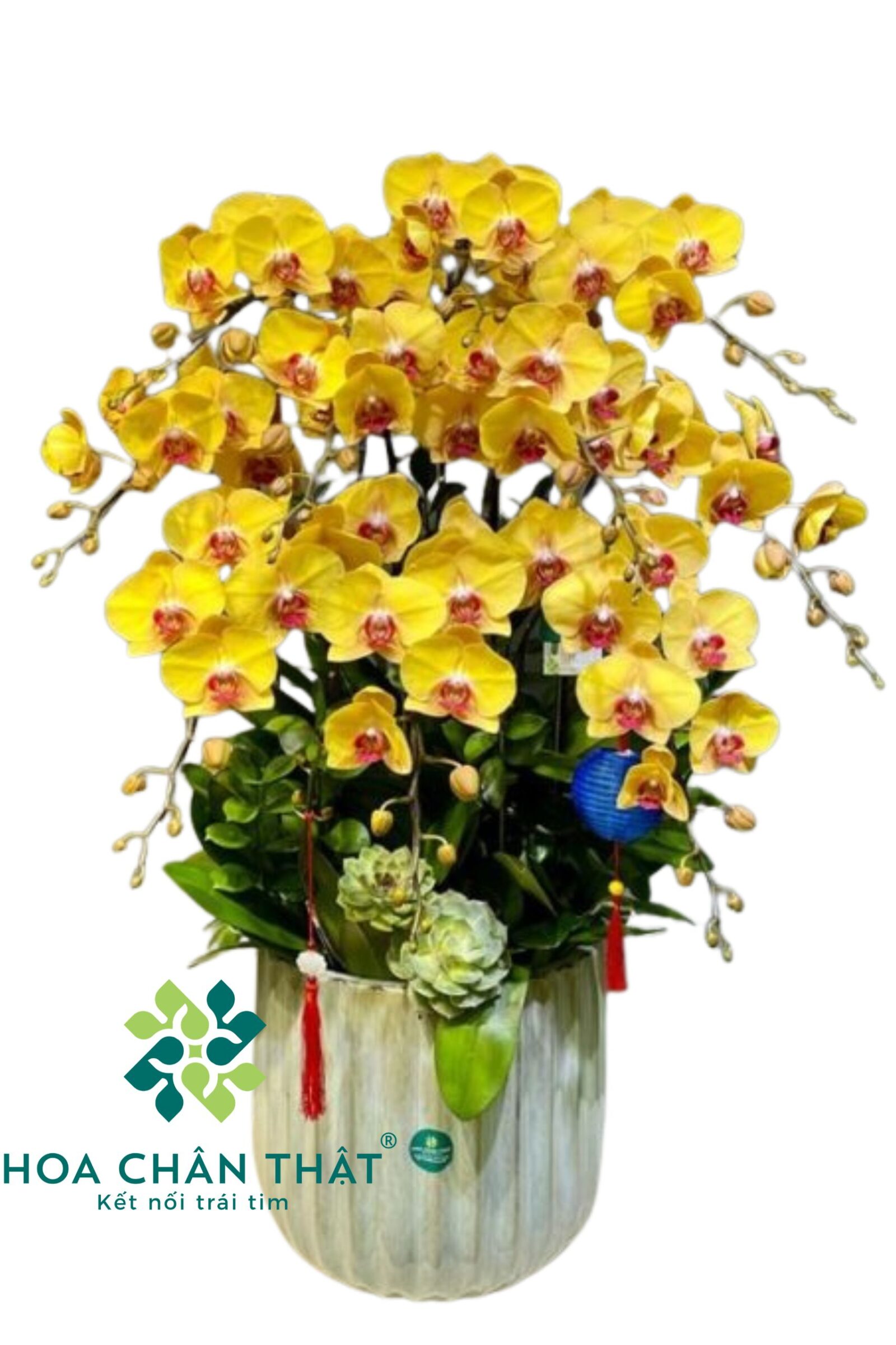 Kim Vân Cát Tường là một tuyệt phẩm hoa lan mang đậm hơi thở của sự may mắn và thịnh vượng. Tác phẩm gây ấn tượng mạnh với 10 nhành lan hồ điệp vàng cánh hoa to rực rỡ, điểm xuyết phần lưỡi đỏ nồng nàn như những viên ngọc quý. Sự tương phản đầy nghệ thuật giữa sắc vàng kim và đỏ thắm không chỉ tạo nên hiệu ứng thị giác cuốn hút mà còn tôn vinh vẻ đẹp quyền quý, kiêu sa của dòng lan hồ điệp cao cấp.