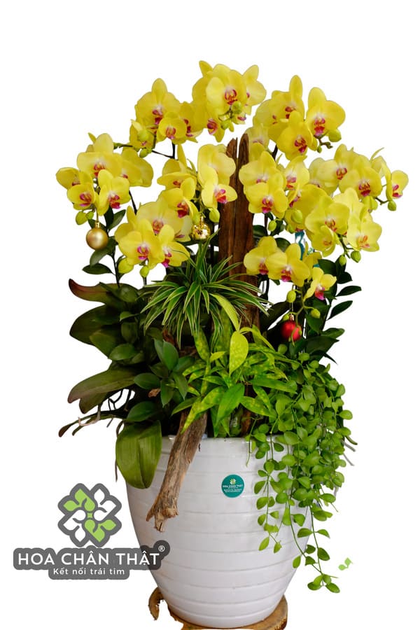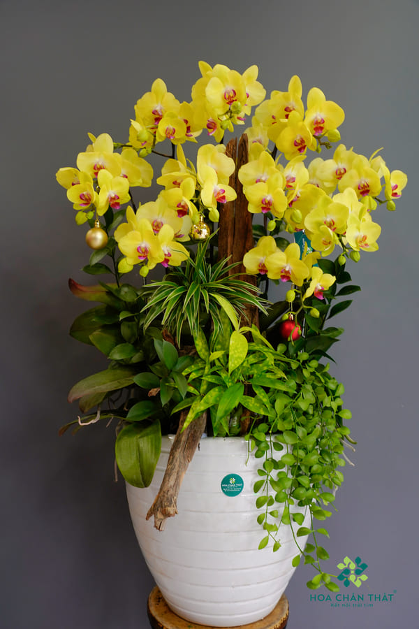 Chậu được thiết kế trong bình sứ trắng tinh tế, phối cùng các loại cây xanh phụ trợ và tiểu cảnh gỗ tự nhiên, tạo nên một bố cục cân đối, hiện đại nhưng vẫn gần gũi với thiên nhiên. Những chi tiết trang trí nhỏ xinh giúp chậu lan trở nên sinh động, phù hợp để trưng bày trong phòng khách, văn phòng, sảnh công ty hoặc làm quà tặng cao cấp.