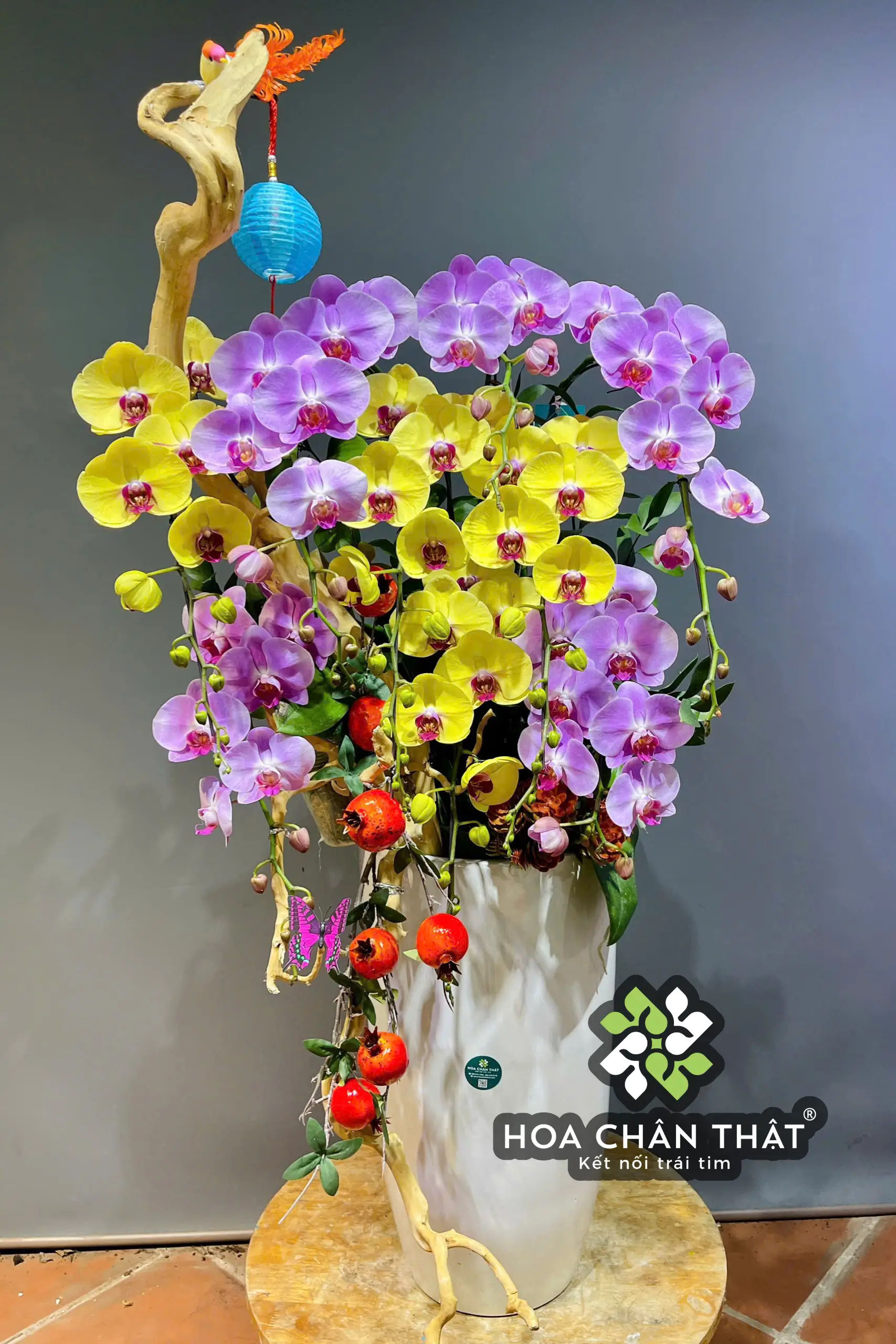 Chậu lan hồ điệp 10 cành vàng tím kết hợp ghép lũa nghệ thuật trong chậu cao, tạo tổng thể nổi bật và đẳng cấp. Màu vàng tượng trưng tài lộc, màu tím đại diện cho sự sang trọng và bền vững. Phù hợp trưng bày dịp lễ, Tết hoặc làm quà tặng doanh nghiệp, đối tác.