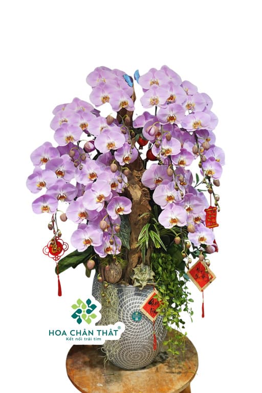 - Nghệ thuật ghép lũa: Thay vì những chậu sứ thông thường, các cành lan được thiết kế ôm trọn thân gỗ lũa tự nhiên. Những đường nét của gỗ lũa qua thời gian tạo nên một bệ đỡ vững chãi, làm tôn lên sự mềm mại của hoa lan.