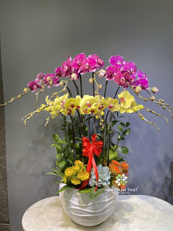 Chậu lan 12 cành vàng phối tím đột biến mang vẻ đẹp ấn tượng, độc đáo và thu hút. Sự kết hợp màu sắc nổi bật giúp chậu hoa trở thành điểm nhấn sang trọng trong các buổi lễ, sự kiện hay không gian tiếp khách.