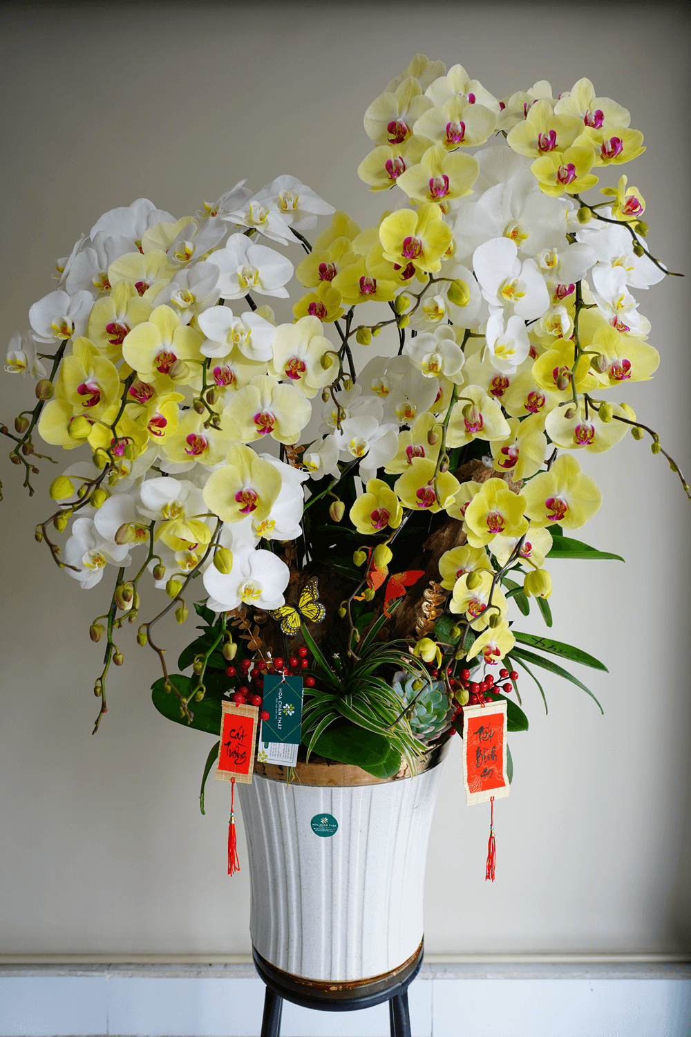 “Bạch Kim Phú Quý” là chậu lan hội tụ hai sắc màu quyền quý nhất của lan hồ điệp – trắng tinh khôi và vàng kim sang trọng.