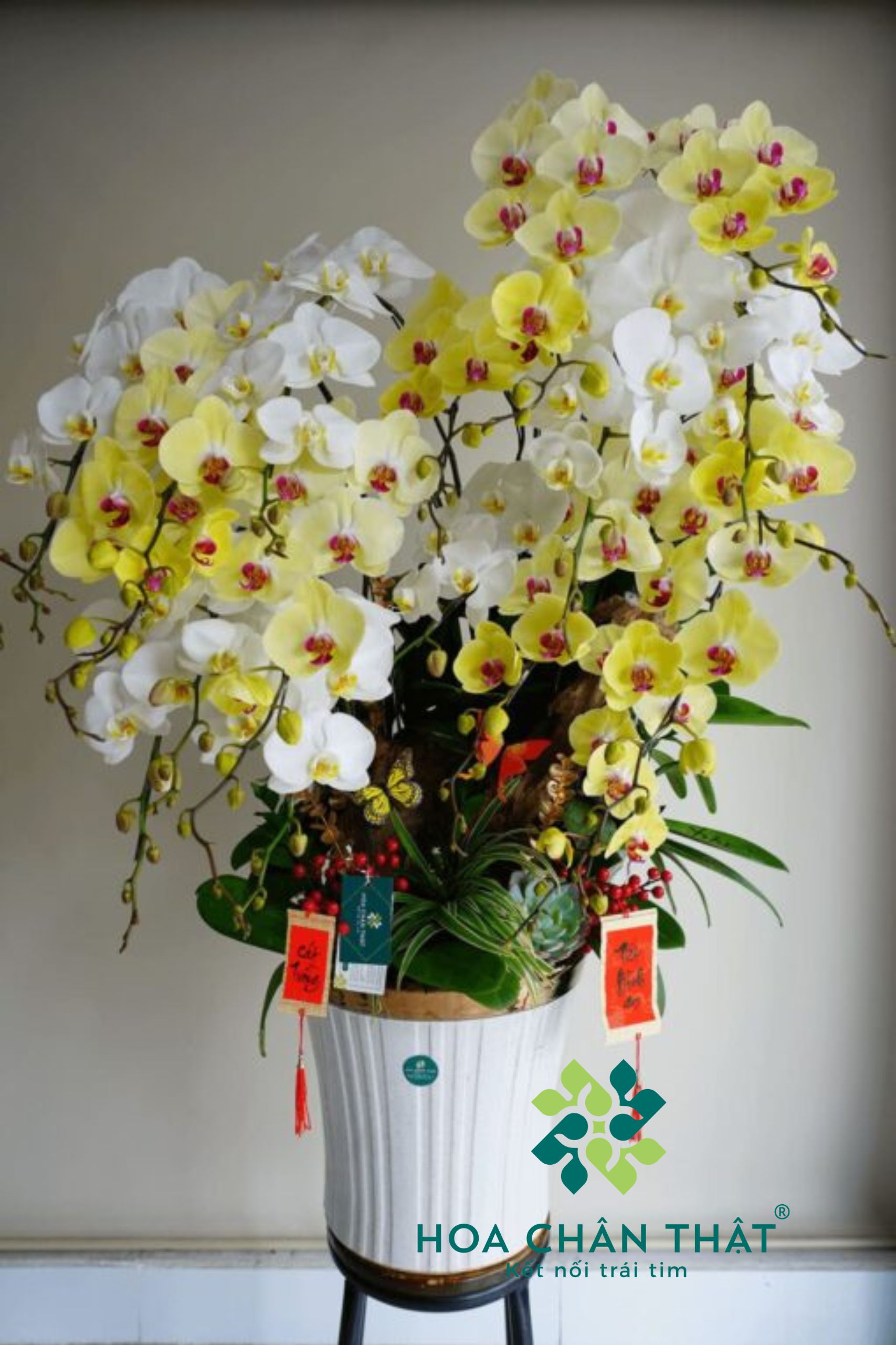 Mỗi cành lan được chọn kỹ lưỡng từ vườn lan Hoa Chân Thật tại Lâm Hà (Lâm Đồng) – nơi khí hậu mát lành quanh năm, cho hoa đều cánh, đậm màu, bền dáng và lâu tàn.