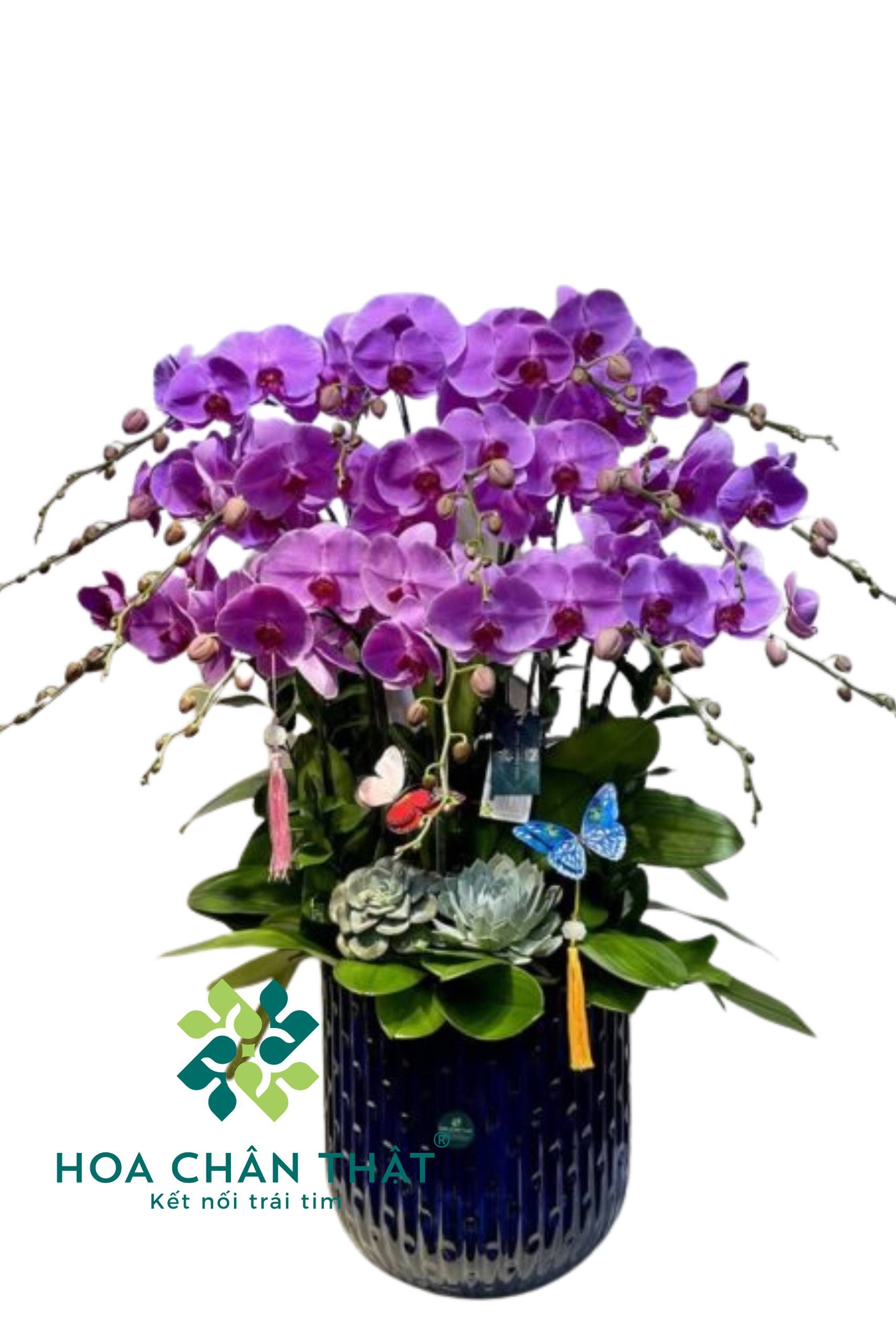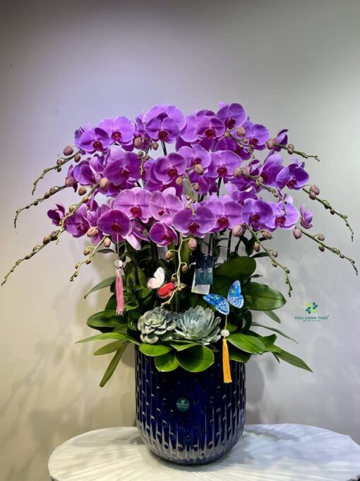 - Từng cánh hoa to, mềm mại, dày dặn được sắp đặt đan xen chặt chẽ, tạo nên một khối hoa rực rỡ vươn cao trên dáng chậu xanh dương cao cấp, sang trọng. Điểm xuyết xung quanh là những nhành lá xanh mướt, những chú bướm uốn lượn quanh hoa lan và các phụ kiện tiểu cảnh nhỏ xinh, gợi lên hình ảnh một gia đình quây quần, hạnh phúc. Đây không chỉ là một chậu hoa trang trí mà còn là tâm điểm mang lại luồng sinh khí tươi mới cho không gian sống.