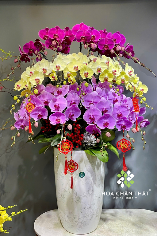 Lan hồ điệp 20 cành bố trí 3 tầng phối tím hồng vàng tạo chiều cao và điểm nhấn nổi bật. Tổng thể hài hòa, sang trọng, phù hợp trưng bày phòng khách hoặc sảnh doanh nghiệp.