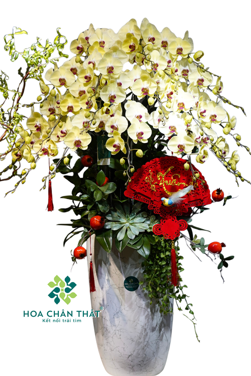 Lan hồ điệp 20 cành vàng mang sắc hoa tươi sáng, biểu trưng cho tiền tài và thành công. Thiết kế chậu cao trắng thanh thoát giúp tổng thể sang trọng và nổi bật trong mọi không gian. Chậu hoa phù hợp trưng bày phòng khách, tiền sảnh, văn phòng hoặc làm quà tặng dịp khai trương, lễ Tết.