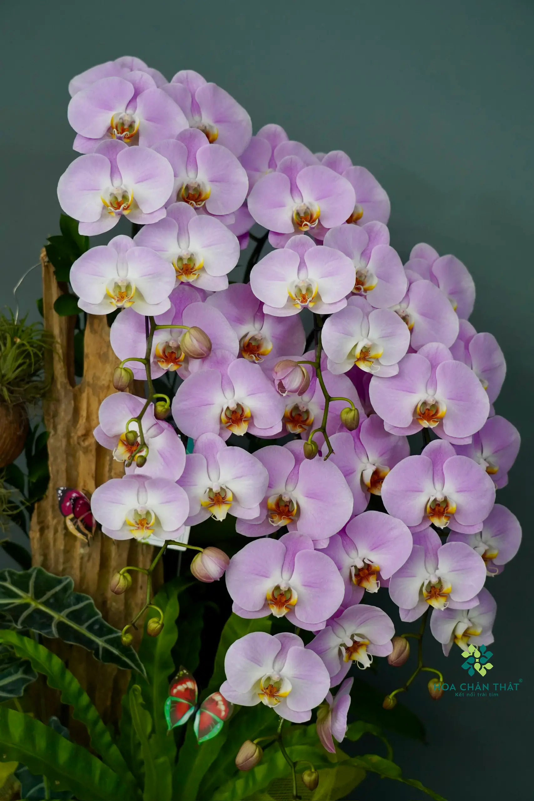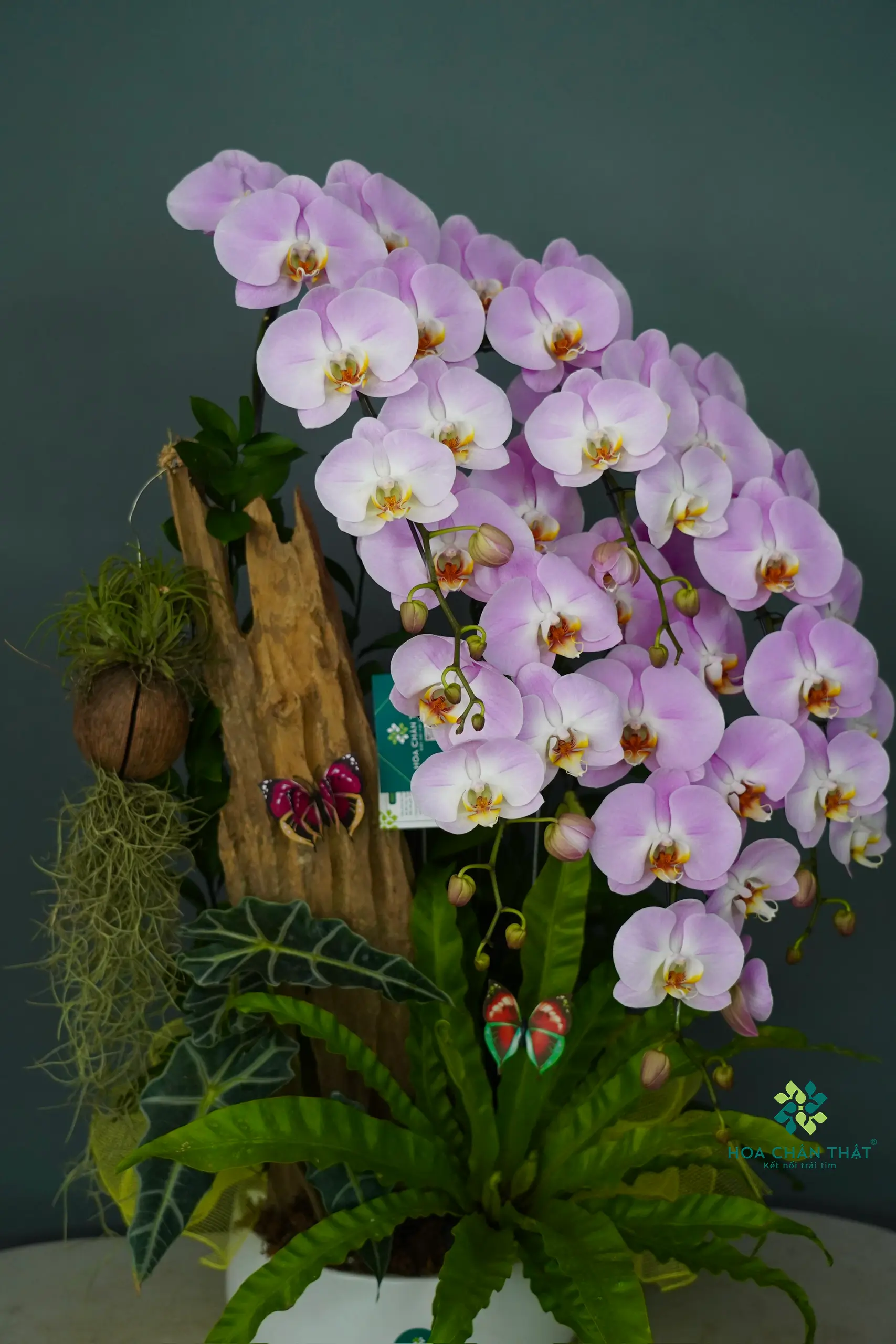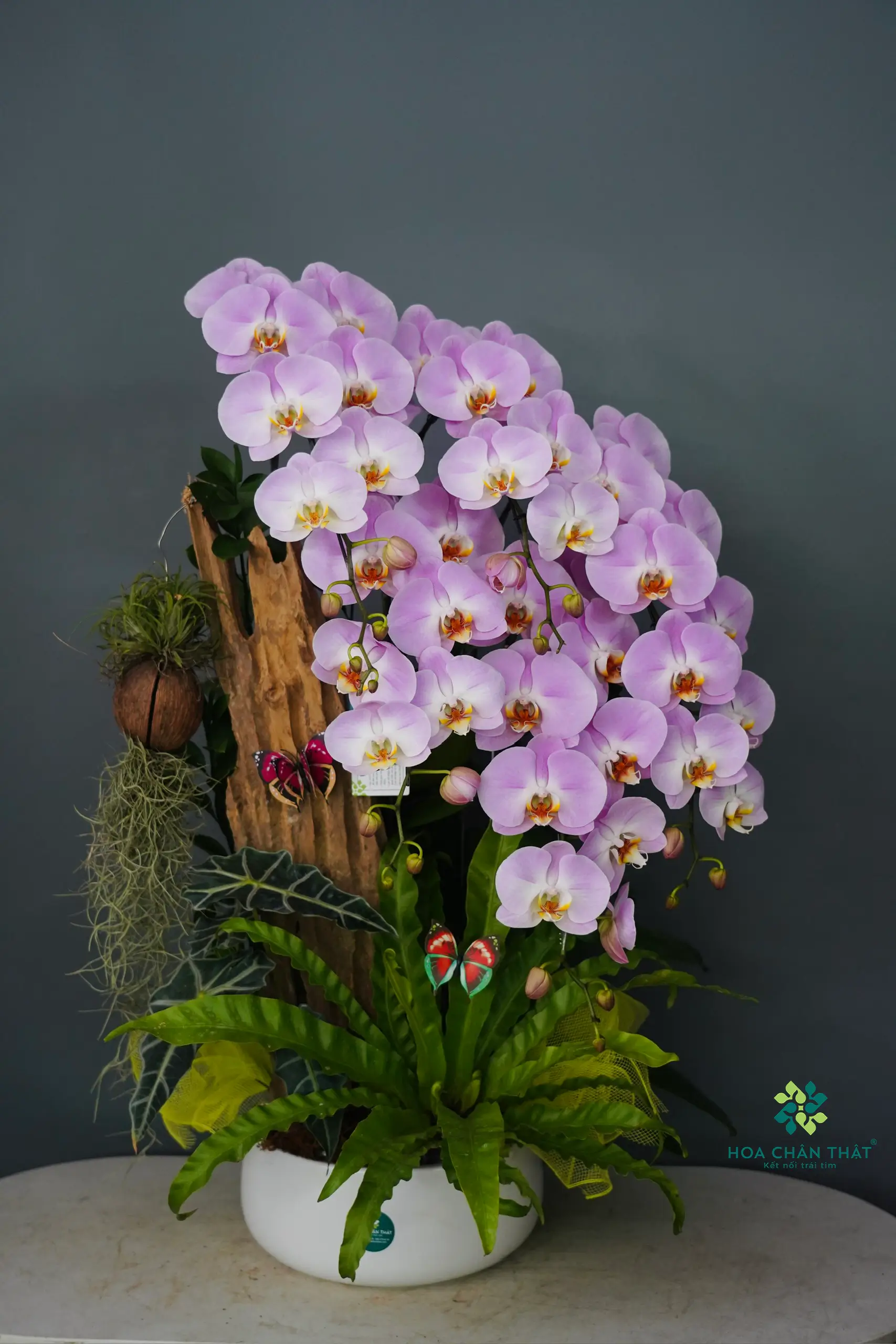 Chậu lan hồ điệp 5 cành Tím Hương An Lạc mang đến nét đẹp nhẹ nhàng, thanh thoát với sắc tím nhạt đặc trưng. Mỗi cành hoa tượng trưng cho sự bình an, may mắn và viên mãn. Chậu lan nhỏ gọn, phù hợp trưng bàn làm việc, bàn tiếp khách hoặc làm quà tặng ý nghĩa cho người thân yêu.