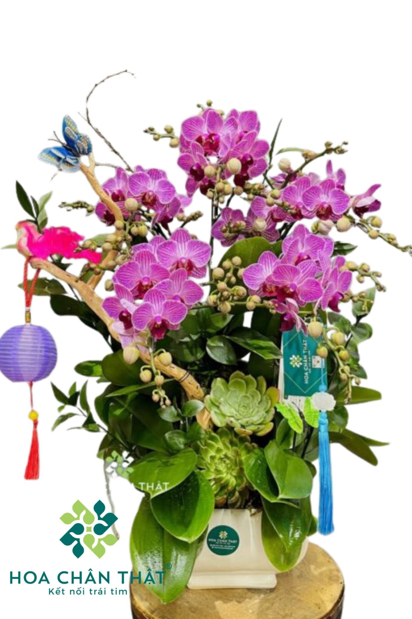 Chậu Lan Hồ Điệp 6 Cành Mini – Phúc Lộc Viên Mãn gây thiện cảm ngay từ ánh nhìn đầu tiên với thiết kế nhỏ gọn nhưng tinh tế. Tổng thể chậu lan được tạo điểm nhấn bằng sắc hoa hài hòa, kết hợp cùng đỗ quyên uốn nhẹ và lồng đèn trang trí, mang lại cảm giác ấm áp và sinh động cho không gian.