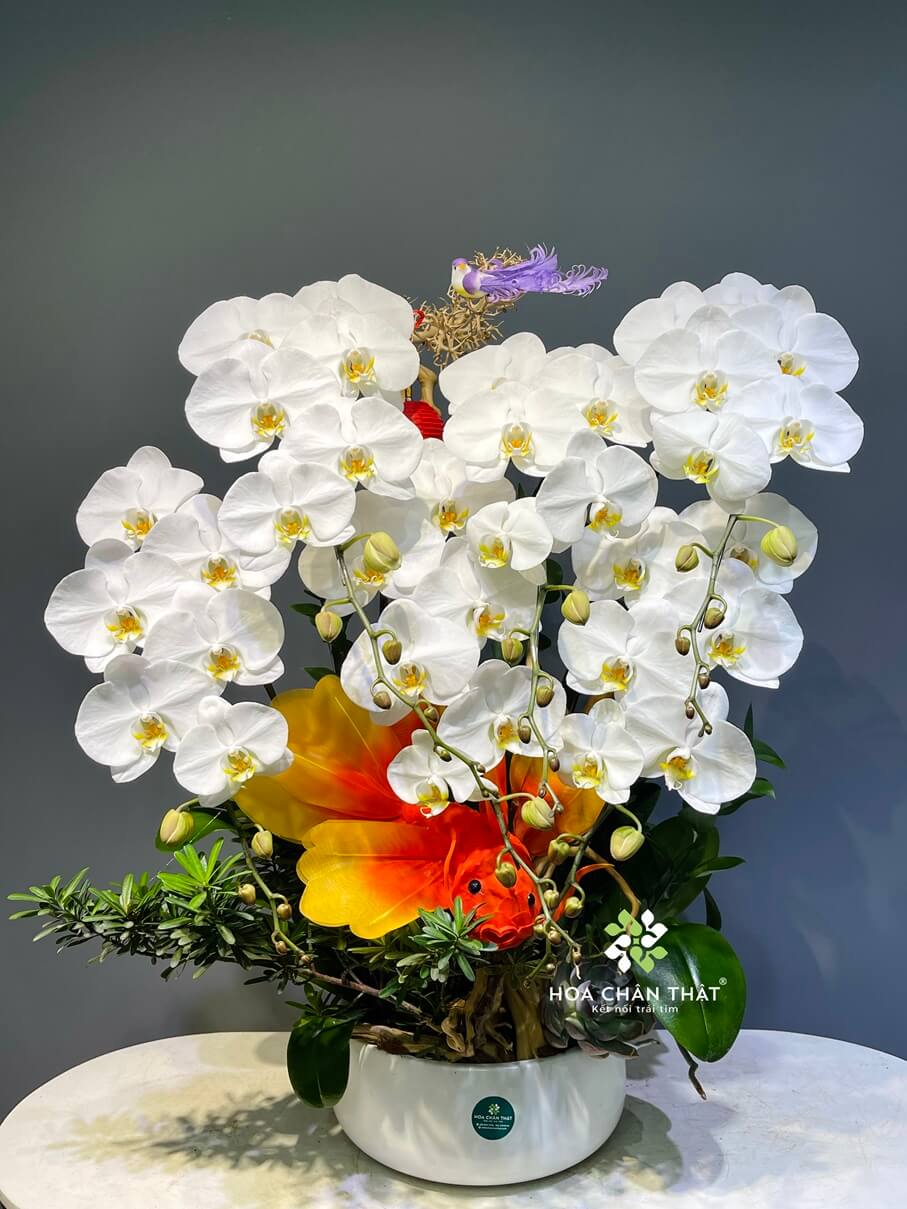 Chậu lan hồ điệp trắng phù hợp trưng bày trong phòng khách, lễ tân, văn phòng hoặc làm quà tặng đối tác, khai trương, tân gia, mang ý nghĩa may mắn, bình an và thành công viên mãn.