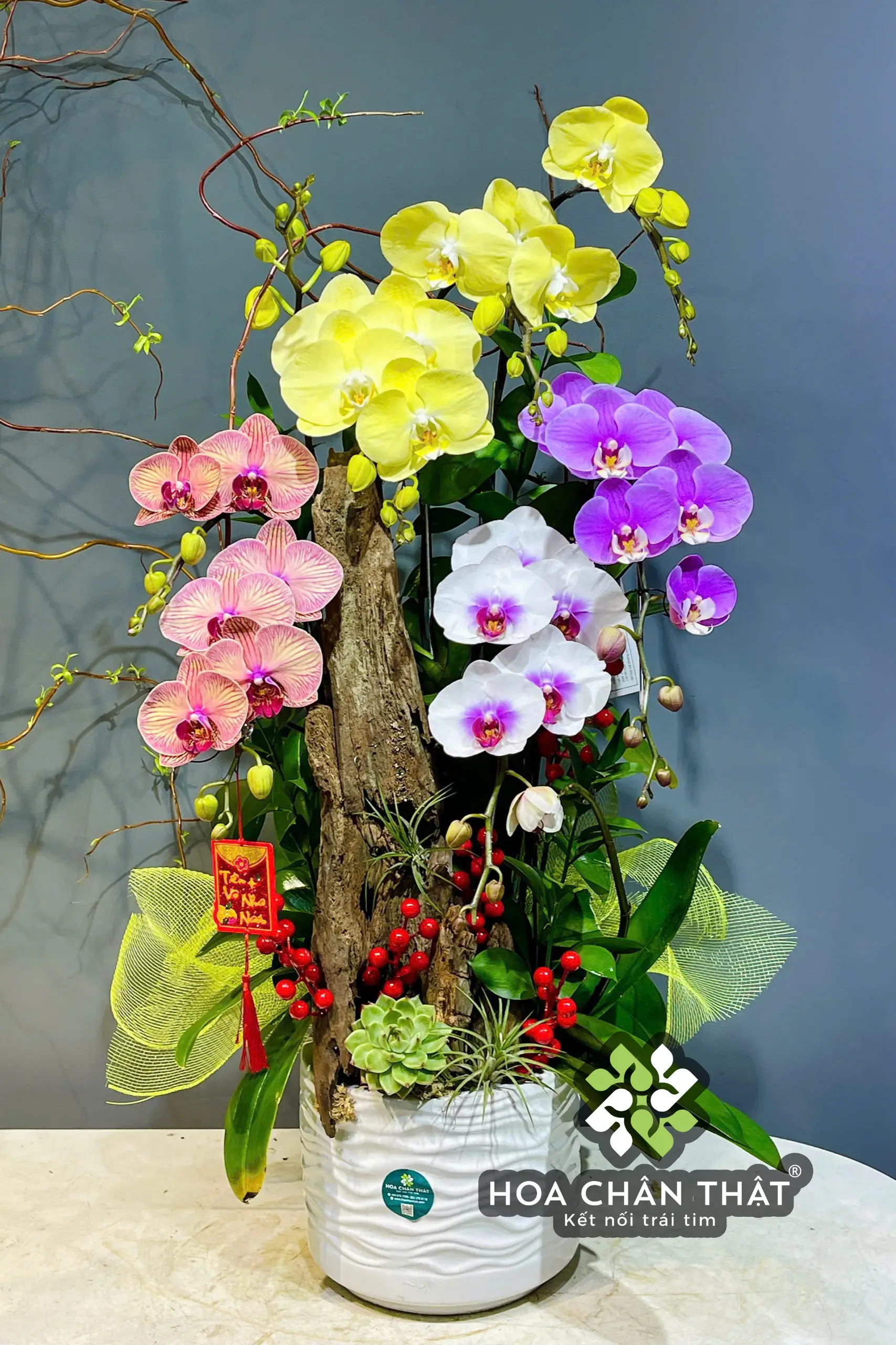 Chậu lan hồ điệp 7 cành ghép lũa nghệ thuật, phối hợp bốn màu vàng – trắng – hồng – tím hài hòa và nổi bật. Thiết kế lũa tự nhiên mang ý nghĩa phong thủy tốt, tượng trưng cho sự cân bằng, may mắn và phát triển bền vững. Phù hợp trang trí phòng khách, bàn tiếp khách hoặc làm quà biếu sang trọng.