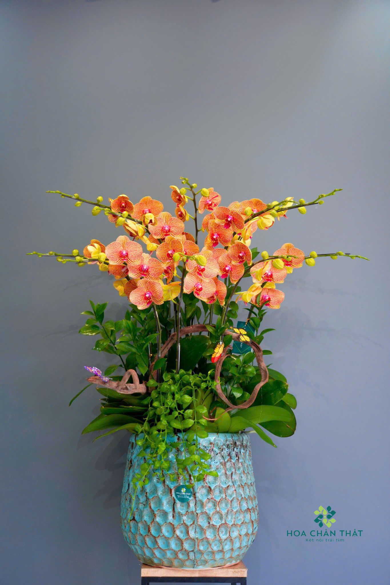 Chậu lan hồ điệp 7 cành Hoàng Cam Phú Quý mang sắc cam rực rỡ – biểu tượng cho may mắn, năng lượng và thịnh vượng. Từng cánh hoa lan căng tròn, được bố trí cân đối tạo nên tổng thể hài hòa, sang trọng. Phù hợp trưng phòng khách, bàn làm việc hoặc làm quà tặng khai trương, tân gia với lời chúc phú quý viên mãn.