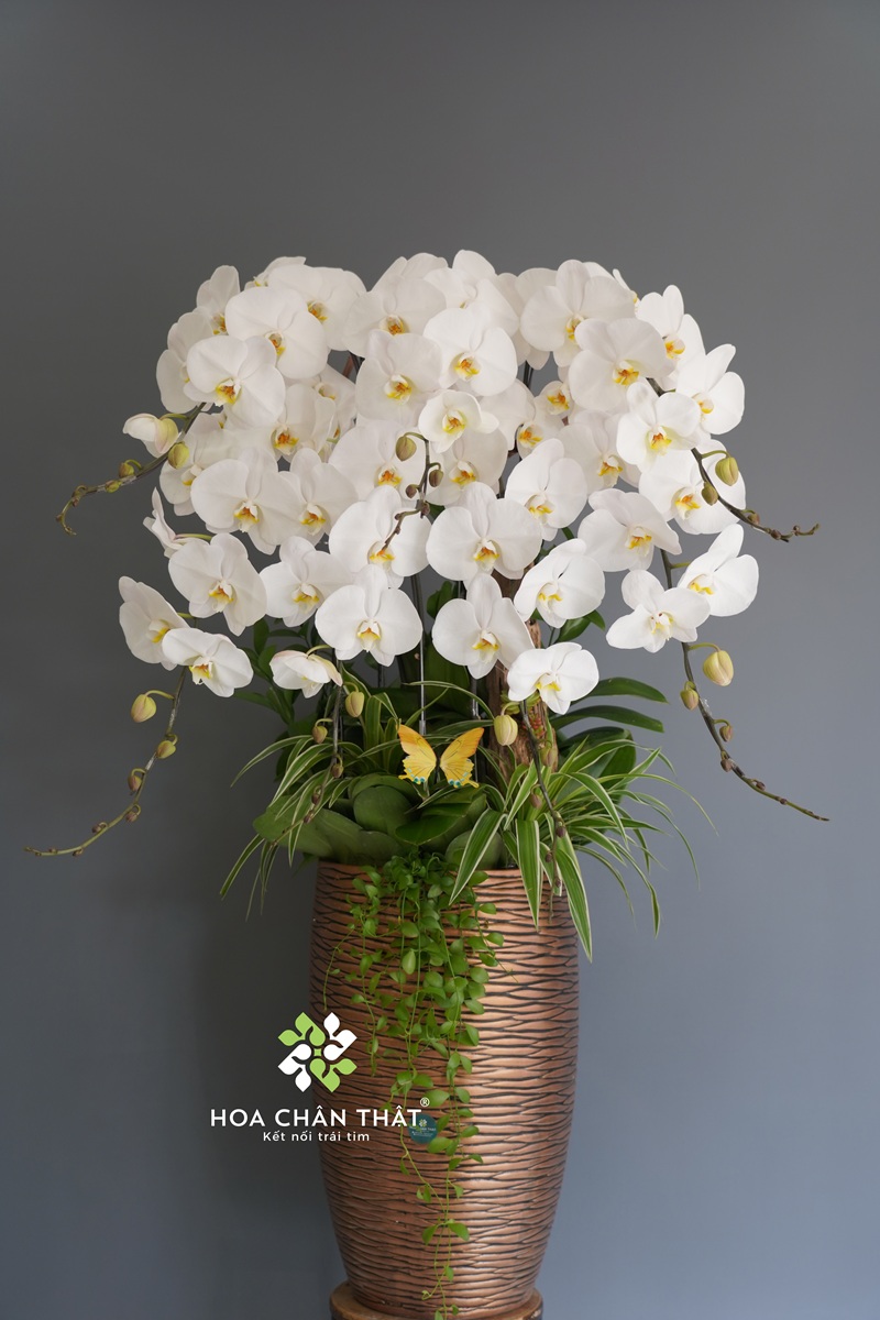 Lan hồ điệp 7 cành trắng mang vẻ đẹp tinh khôi và trang nhã. Thiết kế chậu cao giúp tôn dáng hoa, thích hợp đặt phòng khách, sảnh nhỏ hoặc làm quà biếu ý nghĩa trong các dịp lễ.