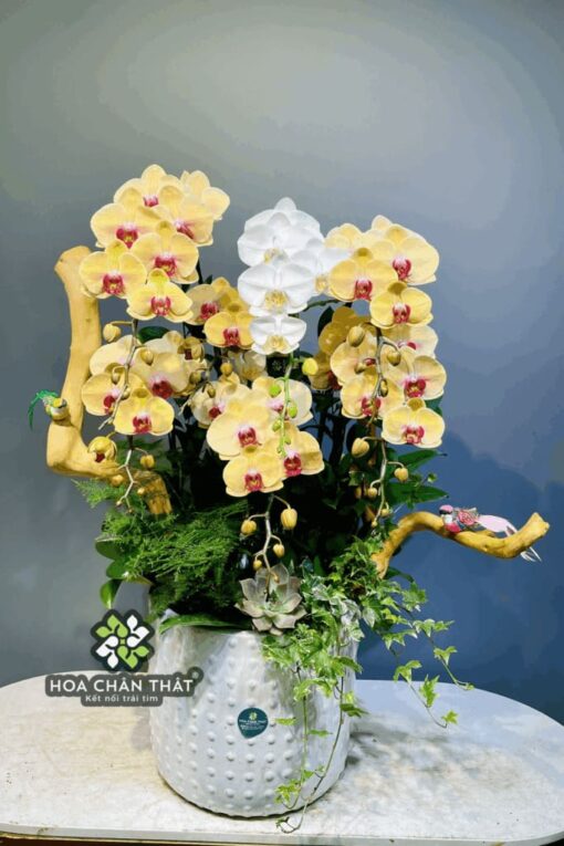 Chậu Lan Hồ Điệp 7 Cành – Vàng Nghệ Trắng An Nhiên mang vẻ đẹp ấm áp nhưng rất nhẹ nhàng, nổi bật bởi sự kết hợp tinh tế giữa sắc vàng nghệ ấm áp và lan trắng thanh khiết. Tổng thể được tạo hình mềm mại quanh khúc đỗ quyên uốn lượn, mang lại cảm giác tự nhiên, có chiều sâu và đầy tính nghệ thuật.