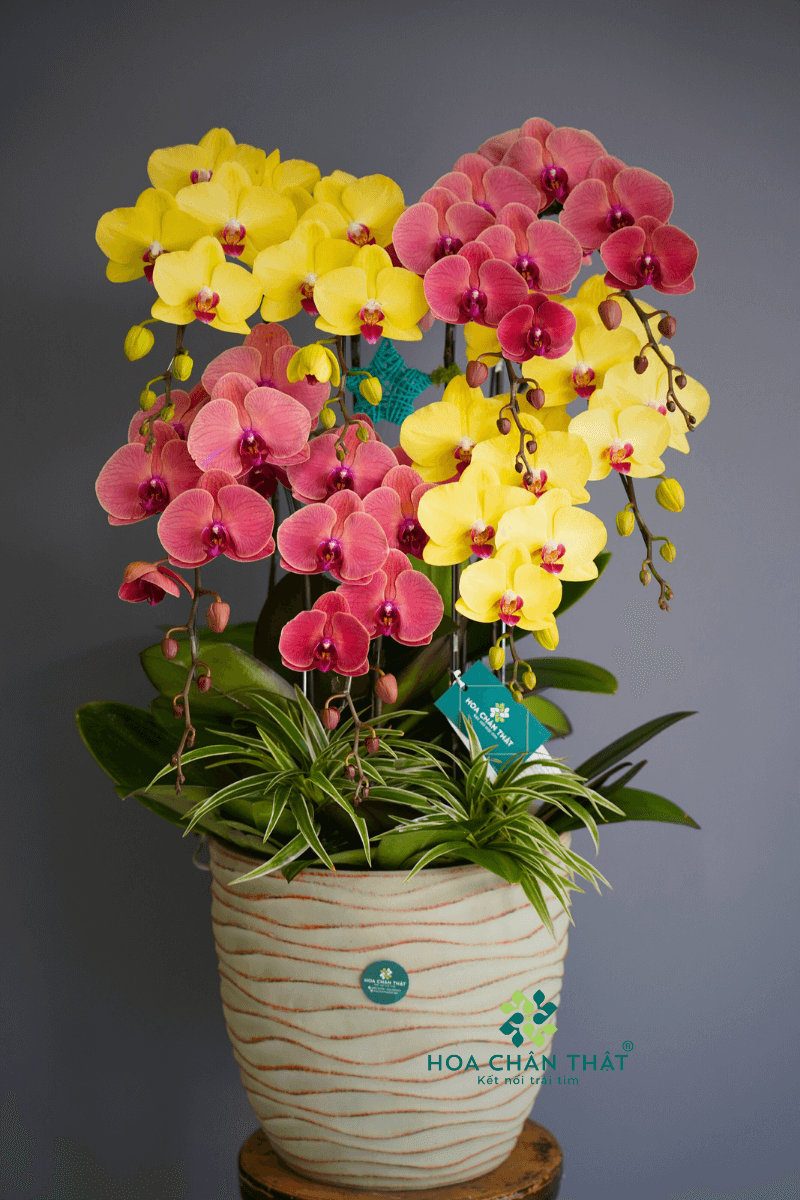 Chậu lan hồ điệp 8 cành Hồng Kim Tụ Lộc nổi bật với sự kết hợp mềm mại giữa hai sắc hoa hồng và vàng. Mỗi cành lan nở đều, căng bóng và bền màu, mang ý nghĩa chiêu tài – tụ lộc – hạnh phúc viên mãn. Phù hợp trang trí hoặc làm quà tặng trong các dịp lễ tết, khai trương.