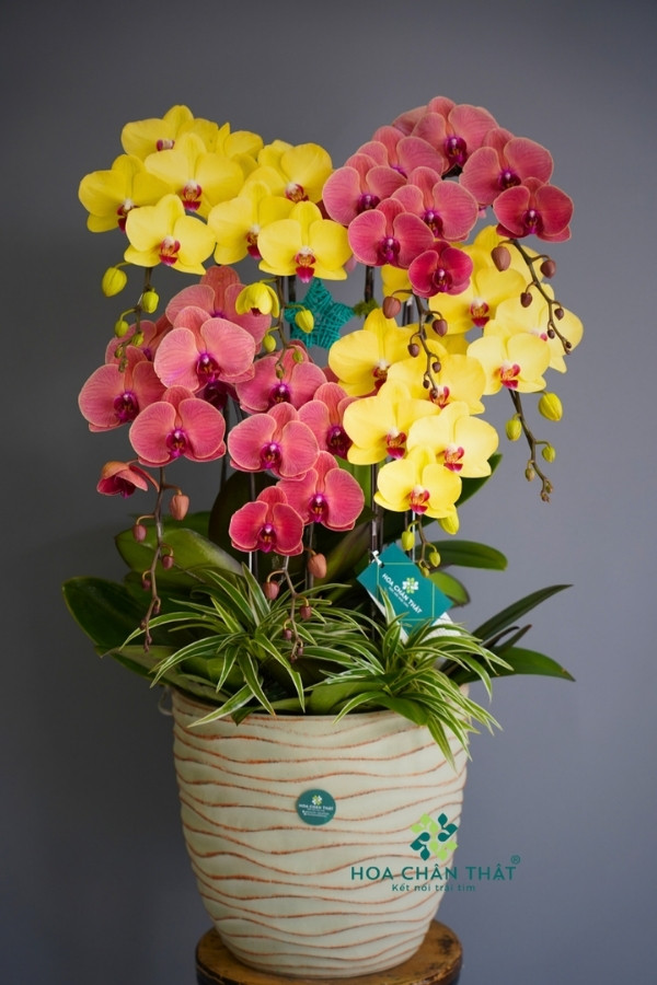 Chậu Lan Hồ Điệp 8 Cành – Hồng Kim Tụ Lộc gây ấn tượng ngay từ cái nhìn đầu tiên với sự phối hợp tinh tế giữa hai gam màu chủ đạo: vàng tươi và hồng đậm. Những cành lan hồ điệp được sắp xếp khéo léo, đan xen hài hòa, tạo nên bố cục tròn đầy, cân đối và bắt mắt.
