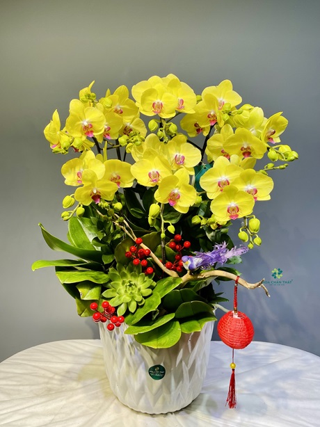 Chậu Lan Hồ Điệp 8 Cành – Kim Sắc Phú Quý nổi bật với sắc vàng rực rỡ – biểu tượng của tài lộc và thịnh vượng. Từng cành lan hồ điệp được chăm tỉa cân đối, mang lại vẻ đẹp sang trọng, cao cấp cho không gian sống. Phù hợp trang trí phòng khách, quầy lễ tân, quán café cao cấp hoặc làm quà tặng khai trương, tân gia mang ý nghĩa may mắn và phú quý trọn vẹn.