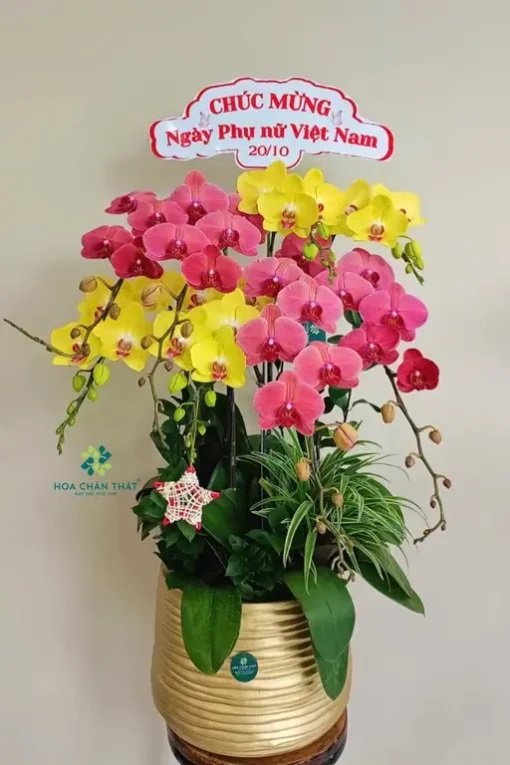 - Thiết kế quý phái: Chậu vàng kim cao cấp làm nền cho sắc hoa thêm rực rỡ, đồng thời tạo nên nét sang trọng rõ rệt. Các chi tiết trang trí được tiết chế, giúp tổng thể không bị rối mà vẫn có chiều sâu.