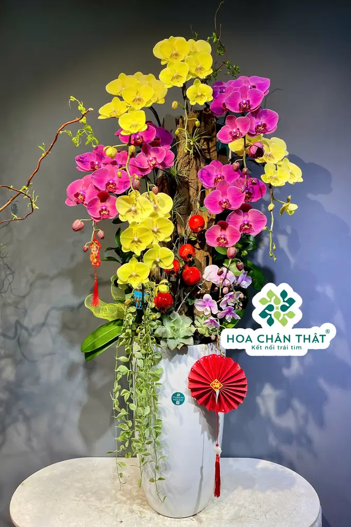 - Bố cục tinh tế: 8 cành lan được tạo dáng vươn cao, tỏa đều trên một gốc gỗ lũa hoặc chậu sứ trắng thanh tao. Điểm xuyết thêm là những phụ kiện trang trí mang đậm nét truyền thống như nơ đỏ, bao lì xì hay các loại cây lá phụ mềm mại, giúp chậu hoa thêm phần sinh động và sang trọng.