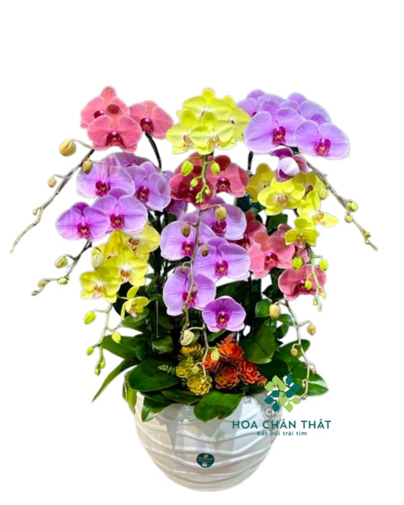 Chậu Lan Hồ Điệp 9 cành kết hợp ba màu Vàng, Tím, Hồng chính là sự lựa chọn hoàn hảo để mang cả không gian xuân tươi mới, ấm áp vào ngôi nhà hay văn phòng của bạn.