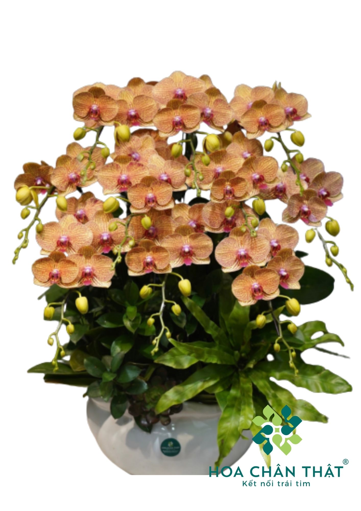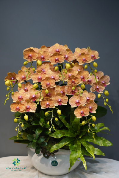 Khi vẻ đẹp được thổi hồn qua từng cánh hoa, chậu lan hồ điệp Cam Vân 10 cành trở thành hiện thân của sự tinh tế, thịnh vượng và may mắn dài lâu. Gam màu cam sọc nổi bật, kết hợp bố cục lan tỏa hài hòa, Cam Vân mang đến không gian sống sự tươi mới, khởi sắc và đầy năng lượng tích cực.