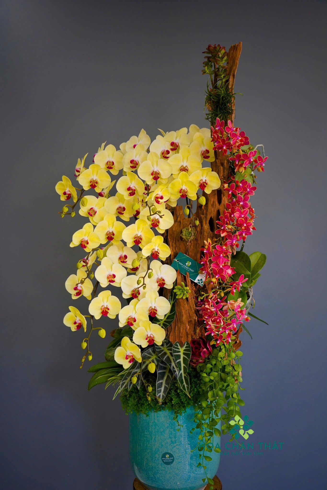 Chậu lan hồ điệp ghép lũa 11 cành Kim Sắc Song Vượng kết hợp hoàn hảo giữa 7 cành lan vàng lớn và 4 cành mini gốc đôi tinh tế. Tông vàng rực rỡ tượng trưng cho tài lộc và phú quý, trong khi chất liệu lũa tự nhiên mang đến vẻ đẹp sang trọng và bền vững. Một món quà đẳng cấp cho doanh nghiệp, khai trương hoặc trang trí không gian sang trọng.