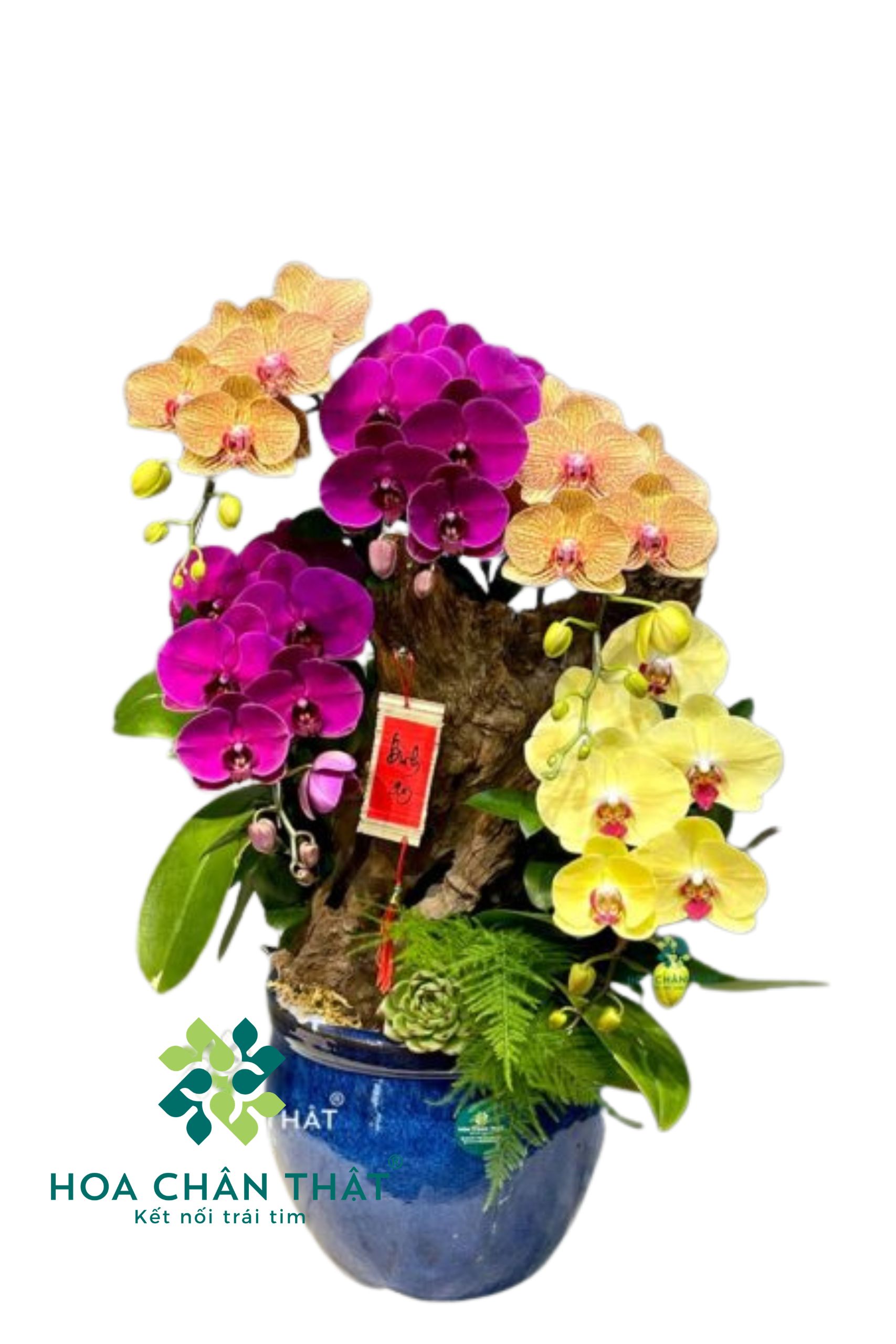 Mô tả sản phẩm Chậu Lan Hồ Điệp Ghép Lũa 5 Cành – Tam Sắc Phú Quý