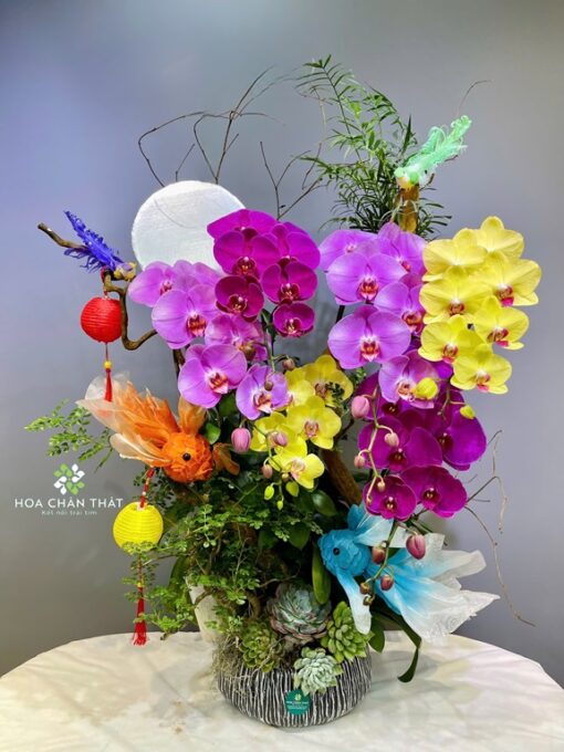 Chậu Lan Hồ Điệp Ghép Lũa 6 Cành – Sắc Ngọc Thịnh Vượng gây ấn tượng với bố cục nghệ thuật độc đáo, nơi lan được ghép trên khúc lũa kết hợp đỗ quyên uốn lượn mềm mại. Ba gam màu tím đậm, tím nhạt và vàng được phối hợp tinh tế, tạo nên tổng thể vừa nổi bật vừa có chiều sâu, mang lại cảm giác sống động và cuốn hút.