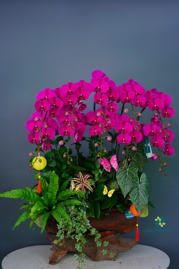 Chậu lan hồ điệp 10 cành tím được thiết kế trên nền máng lũa tự nhiên độc đáo, tạo nên một tổng thể hài hòa giữa thiên nhiên và nghệ thuật. Những cành lan uốn cong mềm mại, hoa nở đều, cánh dày và màu tím đậm nổi bật mang đến cảm giác sang trọng và cuốn hút ngay từ ánh nhìn đầu tiên.