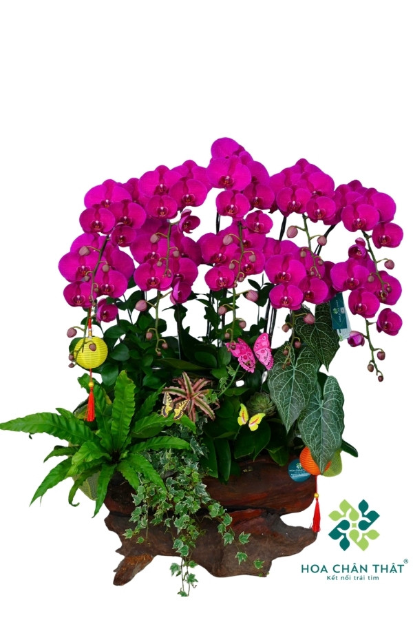 Máng lũa được chọn lọc kỹ lưỡng với đường vân gỗ tự nhiên, kết hợp cùng các loại cây phụ như dương xỉ, trầu bà, lá gấm… giúp tổng thể chậu lan thêm phần sinh động, gần gũi với thiên nhiên. Điểm xuyết thêm các phụ kiện trang trí như bướm, lồng đèn nhỏ tạo nên nét duyên dáng và tinh tế.