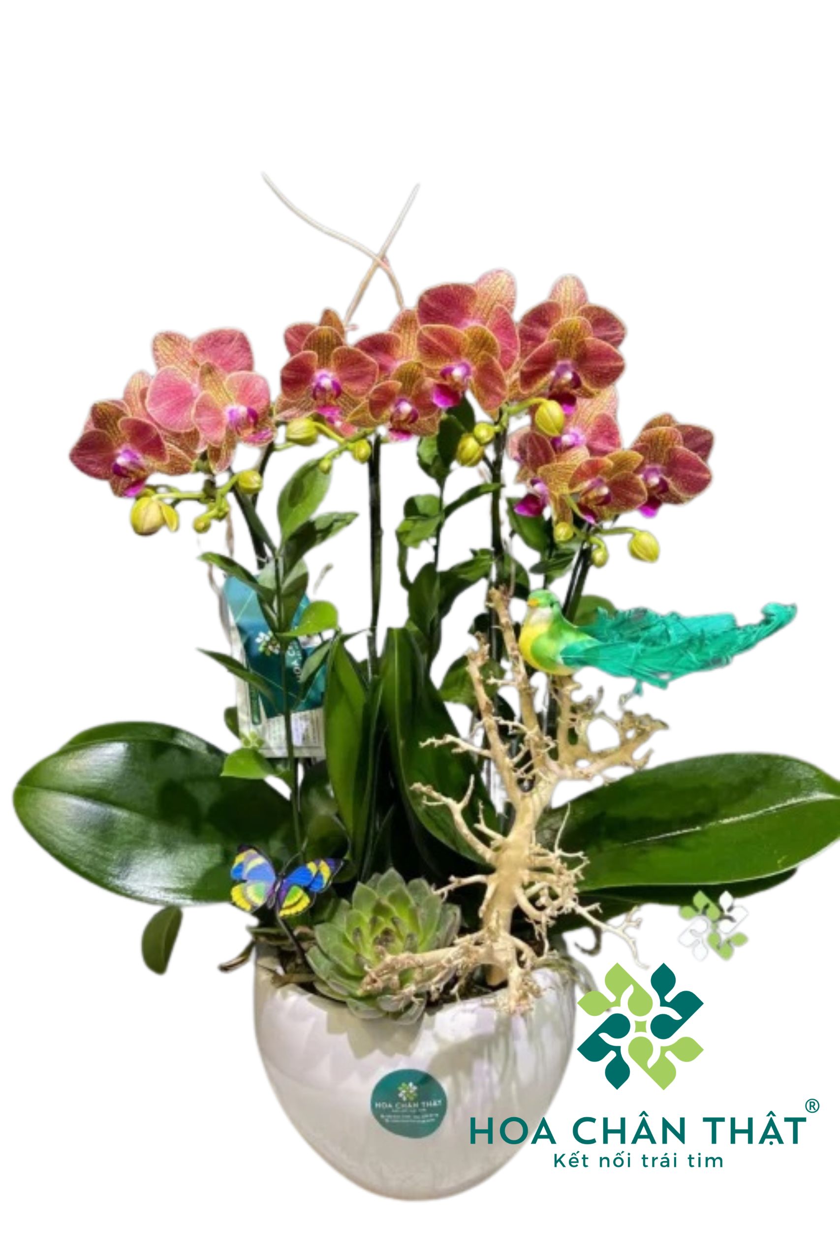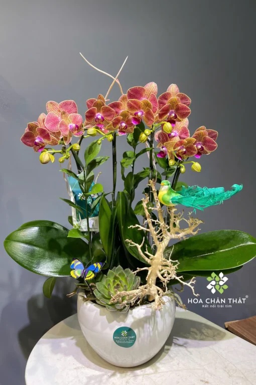 - Thiết kế nhỏ gọn, sinh động: Chậu trắng tròn tạo nền tinh giản, kết hợp cùng sen đá, cây xanh, đỗ quyên, chim và bướm trang trí giúp chậu lan thêm phần sống động. Các chi tiết được bố trí khéo léo, tạo điểm nhấn mà vẫn giữ được sự tinh tế.