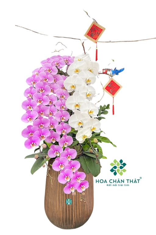 - Thiết kế tinh tế: Hoa được trưng bày trong chậu gốm vân sọc sang trọng, điểm xuyết thêm các phụ kiện mang đậm nét văn hóa Á Đông như liễn đỏ chúc mừng và đôi chim trang trí, tạo nên một tổng thể sống động và đầy tính nghệ thuật.