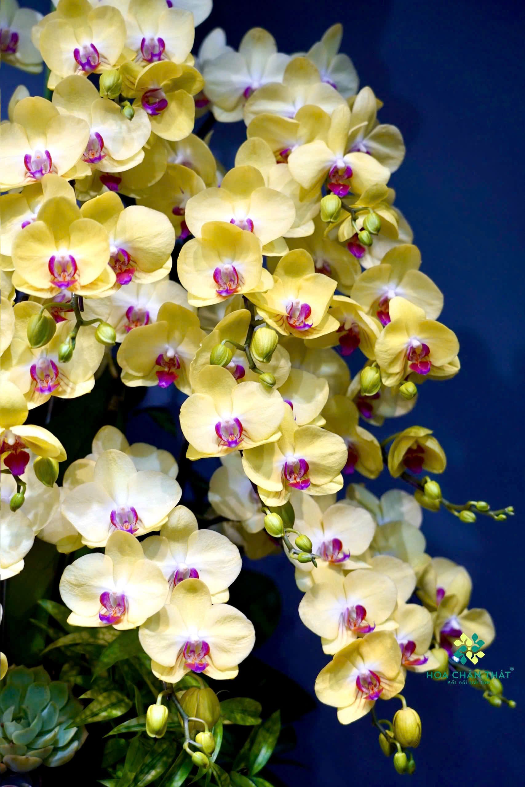 Lan hồ điệp vàng mang đến cảm giác ấm áp – vững chắc – giàu có. Sắc vàng tươi như ánh mặt trời sớm mai, lan tỏa nguồn năng lượng tích cực, khơi dậy sự tự tin và phát triển. 21 cành lan được bố trí đối xứng, uốn lượn mềm mại từ trên cao đổ xuống, tạo thế hoa bề thế mà thanh lịch.