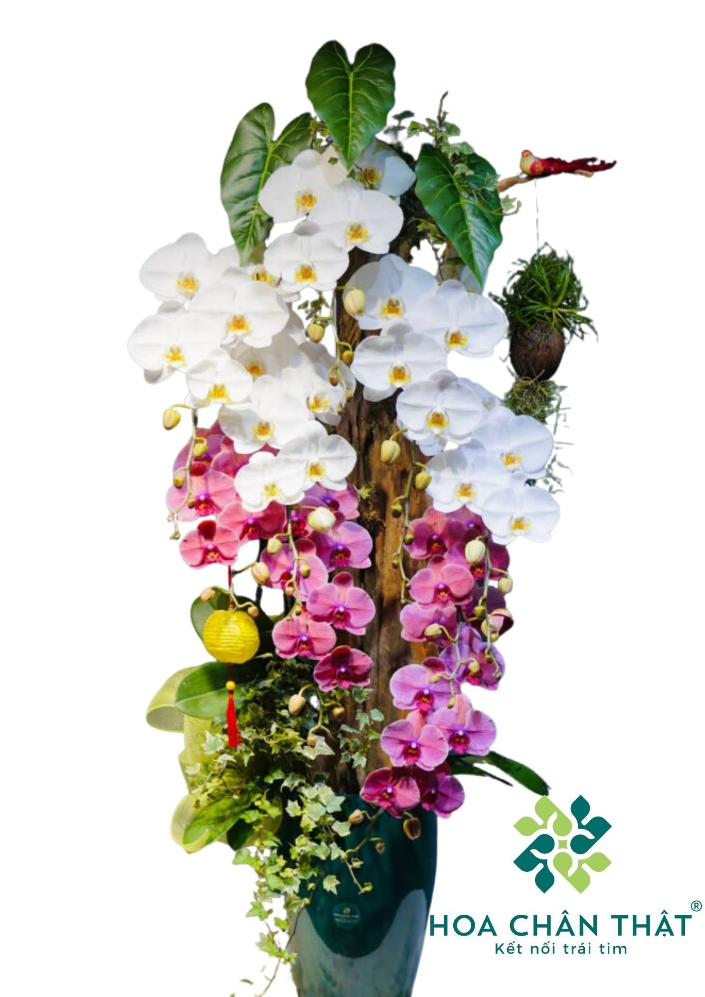 - Lan ghép lũa – Giao thoa sắc ngọc là tác phẩm kết hợp tinh tế giữa hai gam màu chủ đạo trắng tinh khôi và hồng phấn dịu dàng, tạo nên cảm giác thanh lịch mà vẫn tràn đầy sức sống. Chậu được ghép trên thân lũa tự nhiên – mỗi đường vân, mỗi nhánh uốn lượn như một nét chấm phá nghệ thuật, nâng đỡ từng cành lan hồ điệp mềm mại rủ xuống như dòng suối sắc hương.