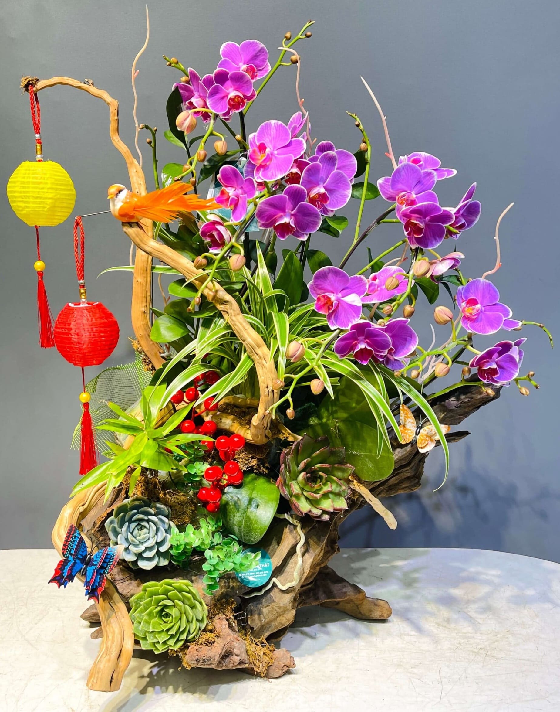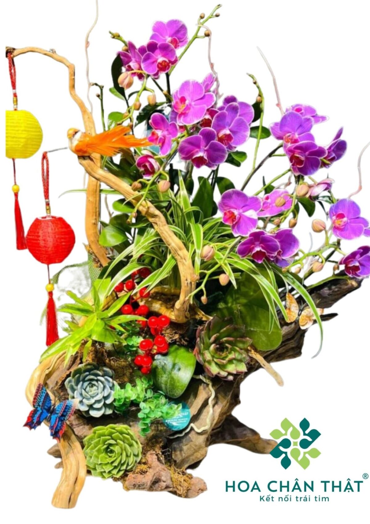 Chậu Lan ghép lũa mini – Sắc tím bình an thích hợp để bàn làm việc, phòng khách, hoặc làm quà tặng khai trương, sinh nhật, tân gia, đặc biệt là trong các dịp lễ tri ân phụ nữ hay năm mới – khi ai cũng mong cầu may mắn và bình yên.