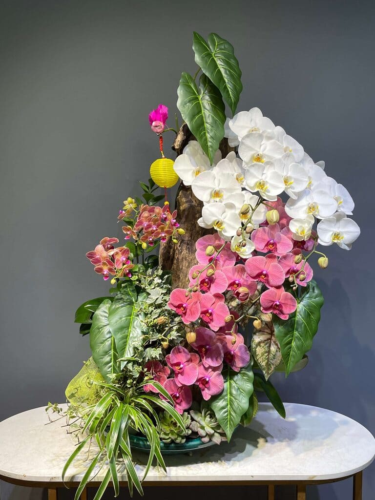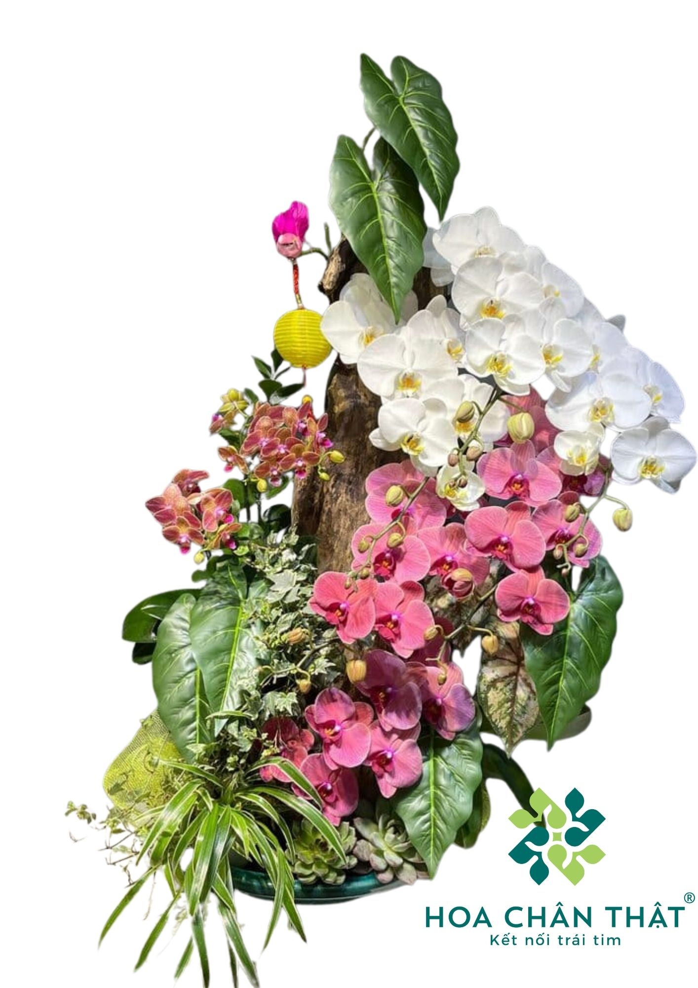 - Sản phẩm được tô điểm thêm bởi đèn lồng vàng, phụ kiện bướm hồng và cụm cây xanh nền – khiến chậu hoa không chỉ đẹp mà còn giàu phong thủy, mang đến vượng khí, tài lộc và bình an cho không gian trưng bày.