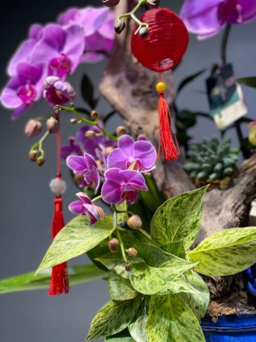 Chậu gồm 10 cành lan hồ điệp đột biến hồng phấn, mỗi cành hoa bung nở rực rỡ như nụ cười hiền hậu của người thầy, người cô – những “người lái đò” lặng lẽ nhưng cao quý. Được phối khéo léo với nền lá xanh đậm và điểm nhấn từ dây leo mềm mại, tổng thể tạo nên cảm giác cân đối – tinh khôi – trang nhã.