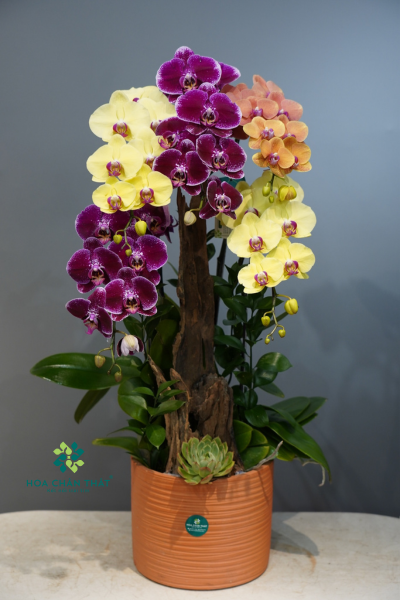 Chậu lan hồ điệp ghép – Tam Sắc là sự kết hợp hài hòa giữa ba gam màu nổi bật: tím sang trọng, vàng tươi sáng và cam ấm áp. Mỗi màu mang một biểu tượng, một ý nghĩa riêng, nhưng khi cùng hội tụ trên nền gỗ lũa thiên nhiên lại tạo thành một tổng thể hài hòa đầy chiều sâu nghệ thuật và phong thủy.