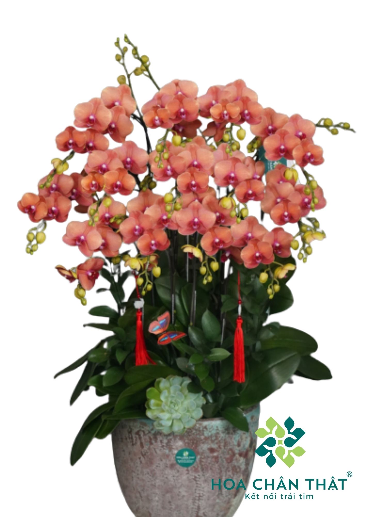 Thiết kế gọn gàng với 12 cành lan hồ điệp được ghép từ hai gốc lan khỏe mạnh, điểm xuyết phụ kiện trang trí chỉn chu như dây lụa đỏ, bướm ngọc, sen đá… tạo nên tổng thể hài hòa, gần gũi mà không kém phần tinh tế.