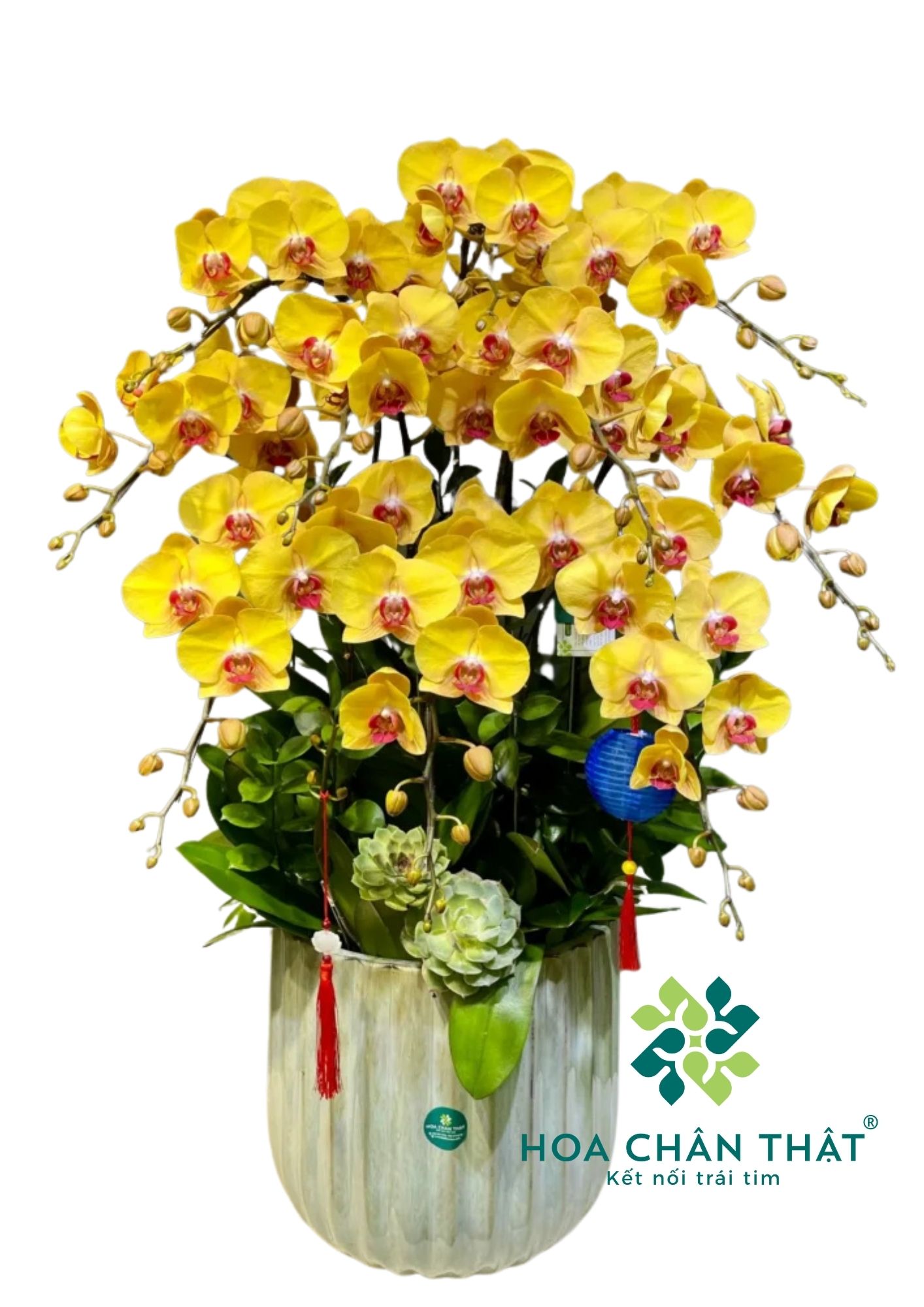 Chậu Lan hồ điệp vàng nghệ – Rạng ngời phú quý là biểu tượng của sự thịnh vượng, may mắn và nguồn năng lượng tích cực. Được thiết kế tinh tế với 10 cành lan vàng nghệ rực rỡ, từng cánh hoa bung nở đều đặn, to khỏe, sắc vàng óng ánh điểm nhụy hồng kiêu sa – như ánh mặt trời sưởi ấm không gian sống.