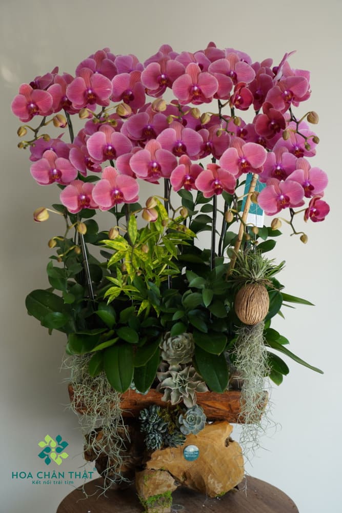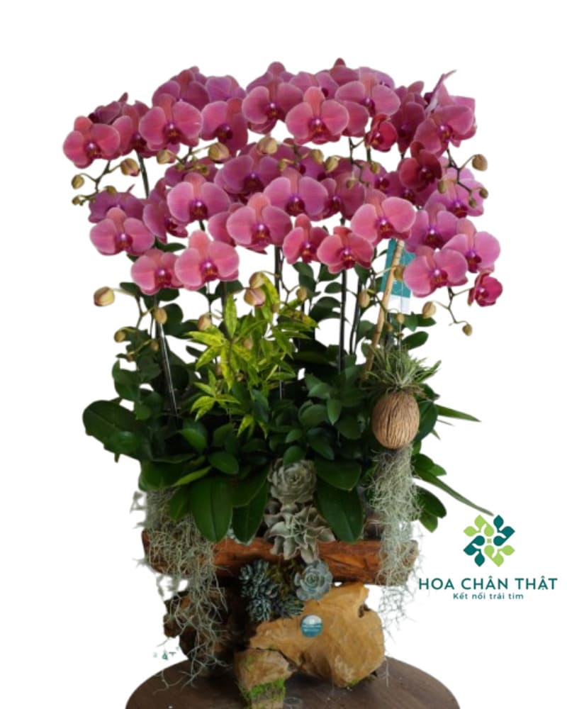 - Thiết kế tinh xảo: 10 cành lan hồ điệp loại A, bông to, cánh dày được tuyển chọn kỹ lưỡng. Các cành hoa được sắp xếp khéo léo theo tầng lớp, hướng về phía trước tạo nên một dải hoa rực rỡ, sum suê.