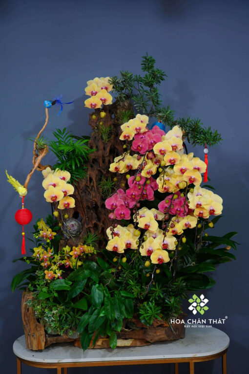 Máng lũa được kết hợp từ 20 cành lan hồ điệp đỏ dâu và vàng nghệ – hai sắc màu tưởng chừng đối lập nhưng lại hòa quyện tuyệt đẹp: