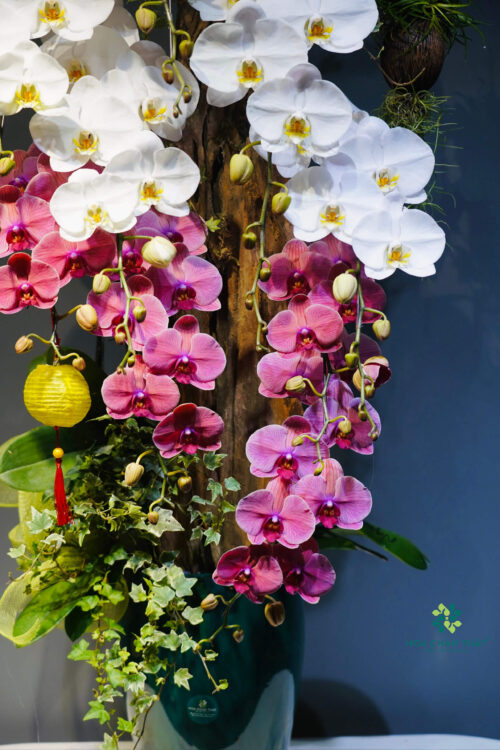 Từng cành lan được sắp xếp theo bố cục thác đổ tự nhiên, điểm xuyết bằng sen đá, lan mini, cỏ dương xỉ và điểm nhấn chim xanh – biểu trưng cho niềm tin, sự bình an và lời tri ân nhẹ nhàng mà sâu sắc.